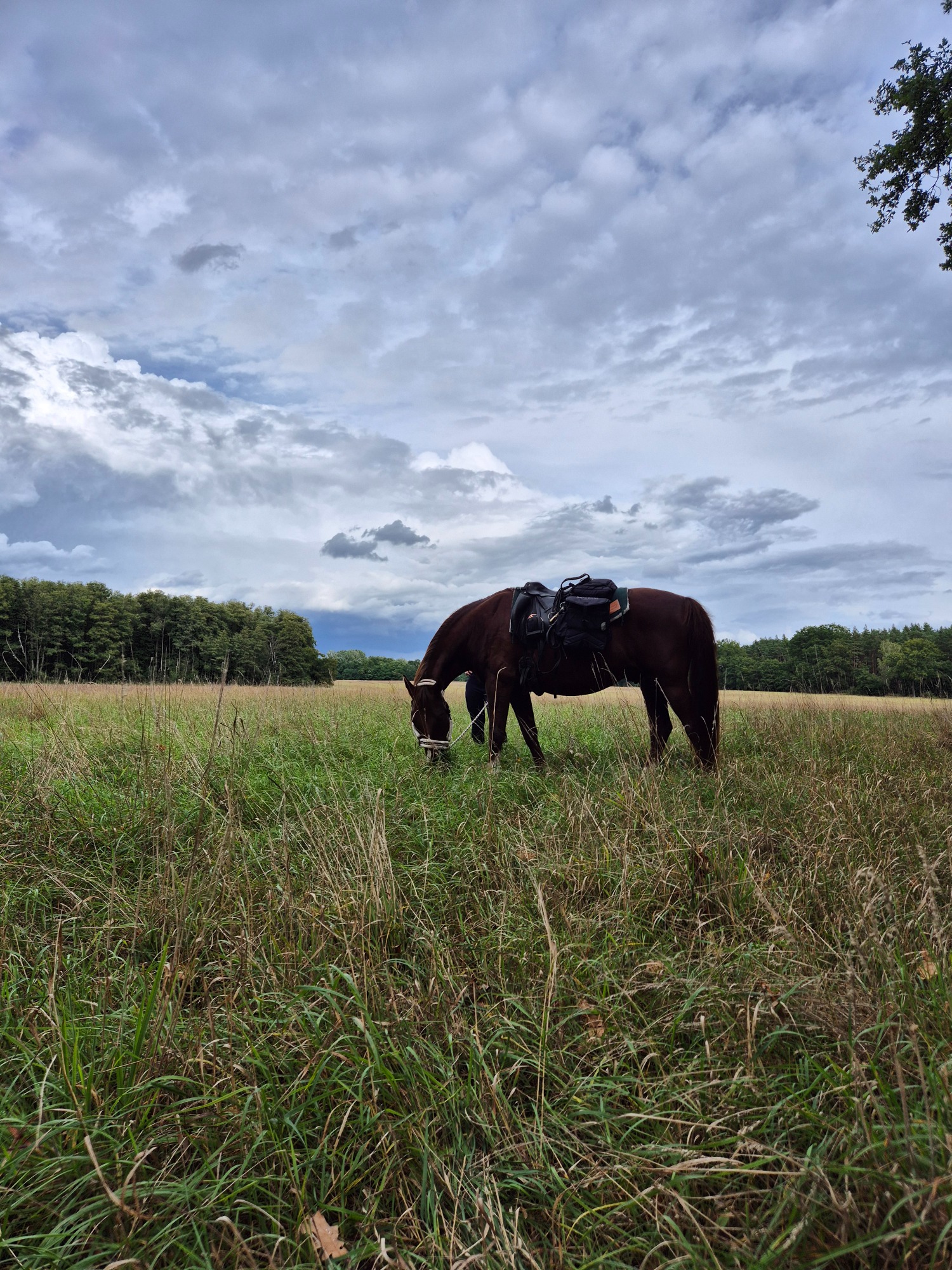 Jede Tagesetappe umfasst etwa 20 bis 30 km, wobei das Tempo stets dem schwächsten Reiter angepasst wird. Alle zwei Stunden legen wir mindestens eine etwa 10-minütige Pause ein. Dabei wird abgestiegen – so können sich Pferd und Reiter die Beine vertreten, die Pferde grasen und entspannen.